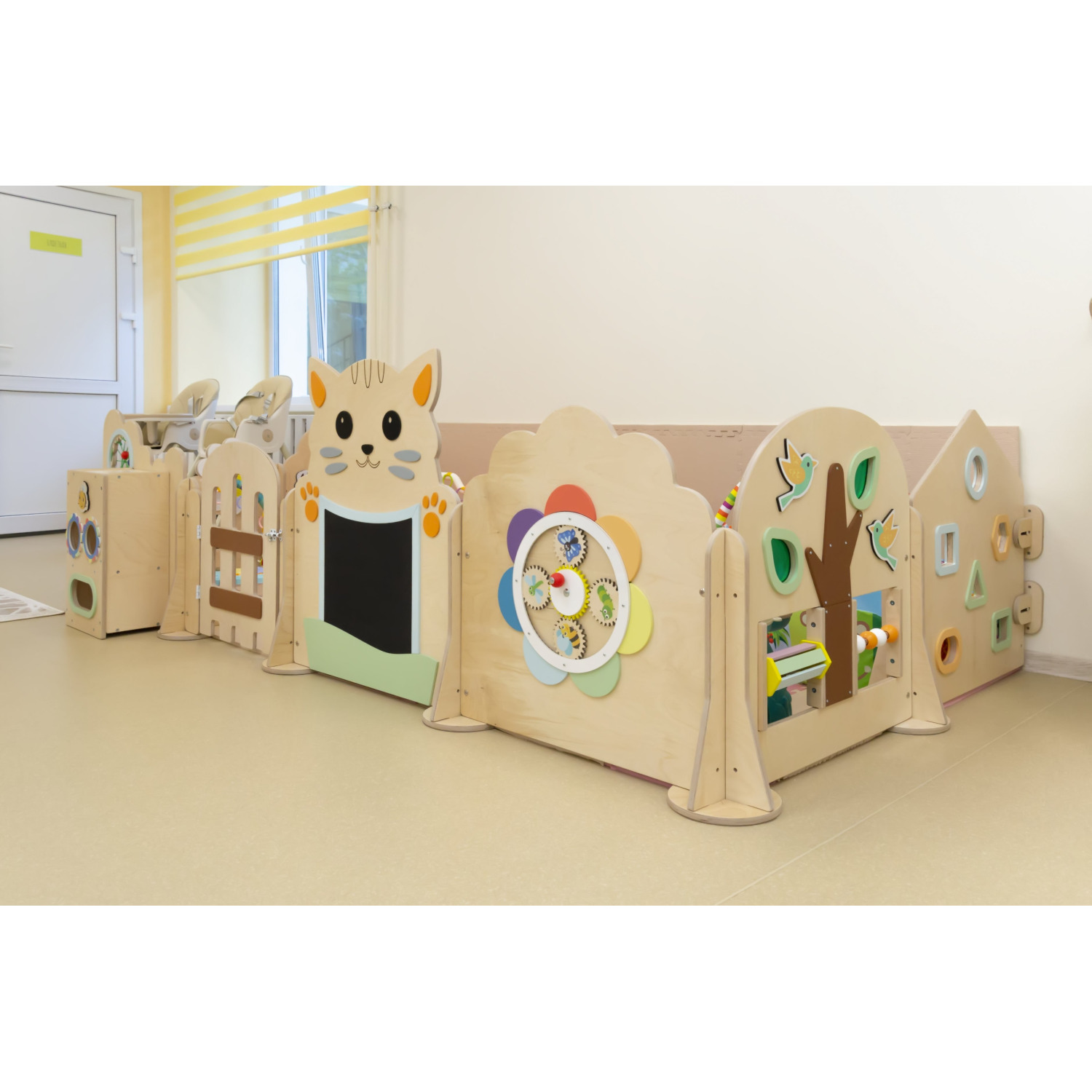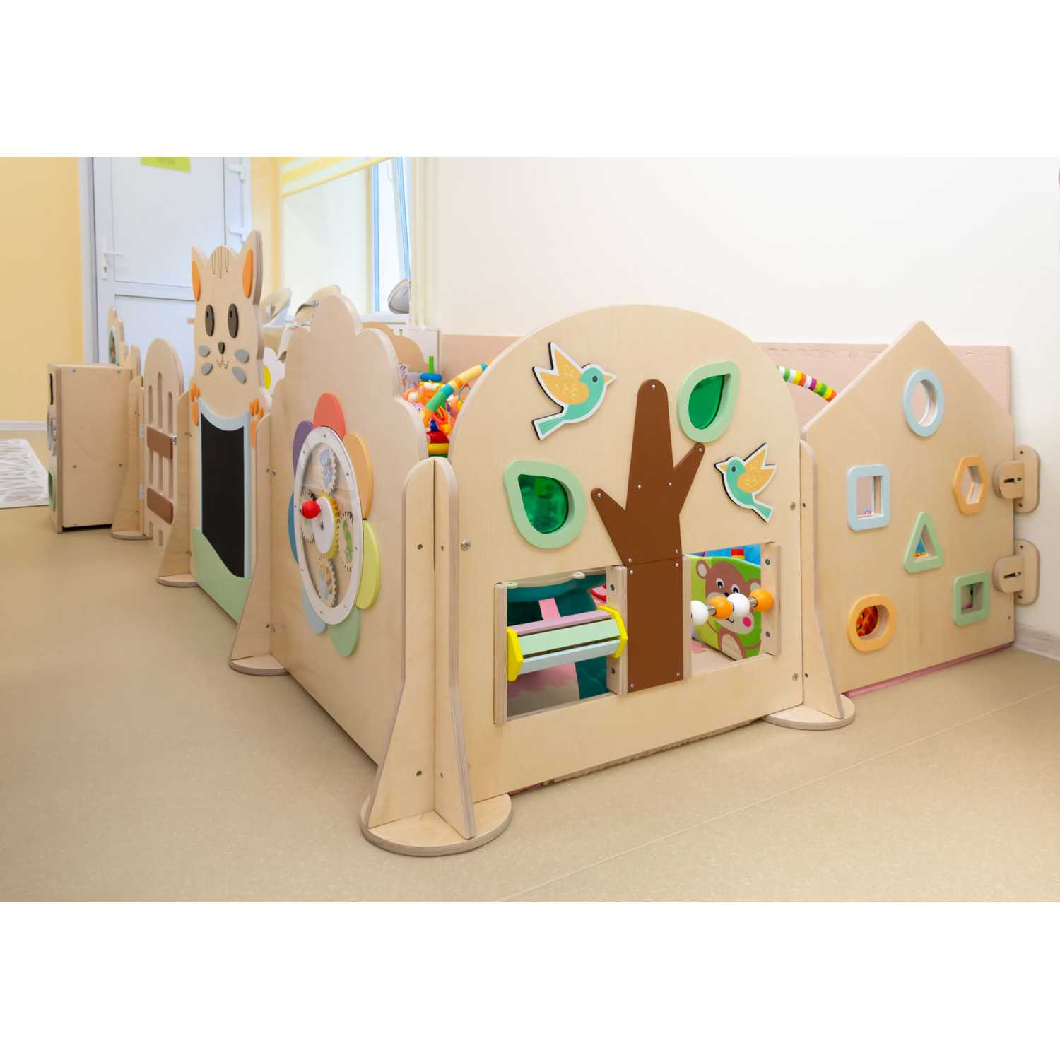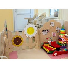 Модули манежа оборудованы множеством игровых элементов: бегунки, тактильные детали разных фактур, лабиринты, окошки-сортеры, меловая доска, шестеренки, звуковой барабан, есть даже безопасное детское зеркало! В таком пространстве малыши чувствуют себя безопасно и уютно, в своем маленьком детском мире. Могут играть, ползать, ходить, прыгать – места достаточно. Очень важно, что в таких детских манежах одновременно внутри могут находиться несколько детей. Это устраняет изолированность ребенка от внешнего мира. Совместные игры малышей в просторном детском манеже способствуют социализации ребенка, развитию коммуникативных навыков, поощряют становление навыков совместной деятельности и кооперации у детей даже самого раннего возраста.