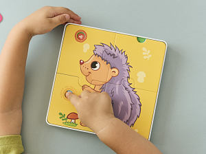 Ребенок может использовать интерактивный планшет отдельно, слушая стихотворения, песни и сказки, а может собрать на планшете простой пазл. Каждая картинка – изображение животного на однотонном цветном фоне, чтобы детям было проще ориентироваться в игре. Когда картинка готова, открывается новая сенсорная зона и пазлы начинают «разговаривать»: озвучивают животных, а также дают речевые и двигательные задания для физического развития ребенка.