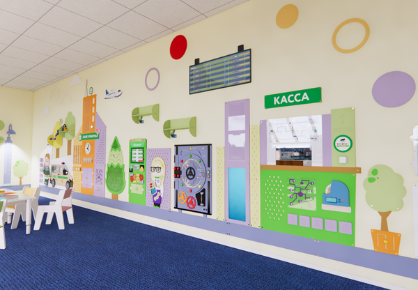 Настенное оборудование представляет собой 16 метров декоративно-развивающих панелей. Это тематические бизиборды, игровые и дидактические элементы, узнаваемые локации и объекты повседневной жизни, представленные в оригинальном дизайне.
